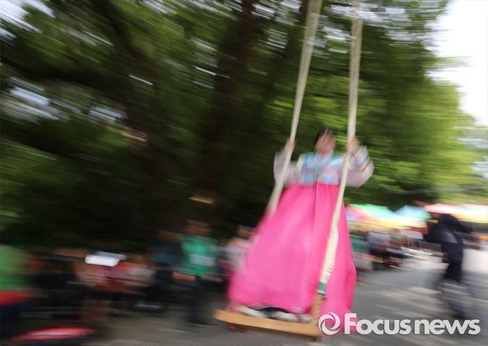 (대전=포커스뉴스) 9일 오후 (음력5월5일) 단오를 맞아 대전 동구 쌍청당공원에서 열린 판암골 단오한마당에서 한복입은 여학생이 그네뛰기를 하고 있다