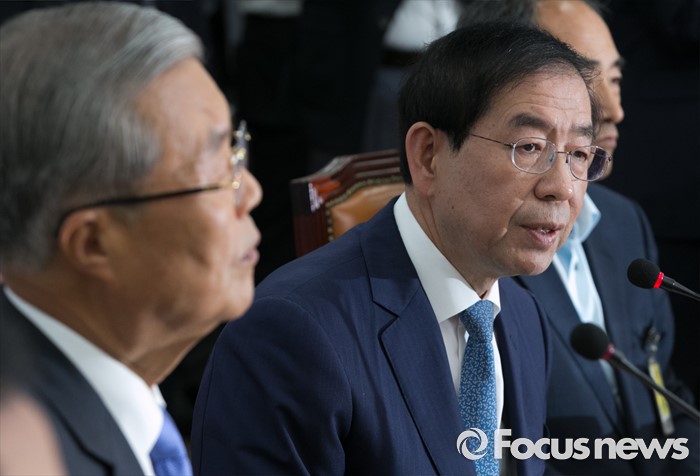 (서울=포커스뉴스) 8일 오전 서울 여의도 국회에서 구의역 스크린도어 노동자 사망 사건과 관련해 열린 더불어민주당-서울시 정책간담회에 참석한 박원순(가운데) 서울시장이 발언하고 있다. 왼쪽은 김종인 비대위 대표.