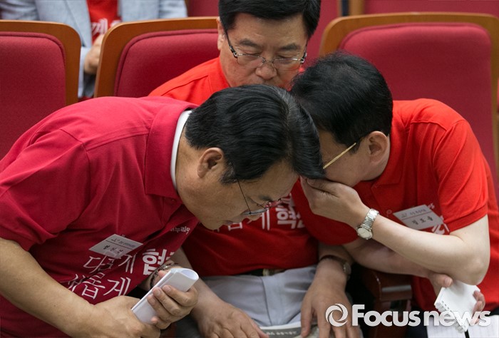 (과천=포커스뉴스) 10일 오전 경기도 과천 국가공무원인재개발원에서 열린 2016 새누리당 정책워크숍에 참석한 정진석(왼쪽부터) 원내대표, 김광림 정책위의장, 김도읍 원내수석부대표가 대화하고 있다.