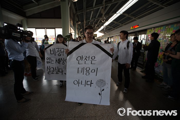 (서울=포커스뉴스) 지난달 28일 서울 지하철 2호선 구의역에서 스크린도어 정비 도중 숨진 김 모씨의 발인을 하루 앞둔 8일 오후 서울 광진구 지하철 2호선 구의역에서 시민들이 김 모씨를 추모하며 행진하고 있다.