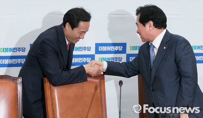 (서울=포커스뉴스) 우상호(왼쪽) 더불어민주당 원내대표가 8일 오후 서울 여의도 국회에서 새누리당의 국회의장직을 야당이 맡고 운영 및 법사위를 여당이 맡자는 제안과 관련 논의를 위한 4선 이상 중진 의원과의 간담회에 참석해 이석현 의원과 인사하고 있다.
