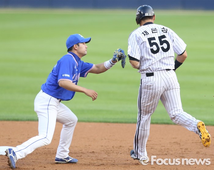 (서울=포커스뉴스) 9일 서울 잠실구장에서 열린 2016 프로야구 삼성-LG 경기 2회말 선두타자로 나와 우중간 안타로 진루한 LG 채은성이 삼성 투수 장원준의 견제구에 걸려 2루에서 아웃되고 있다.