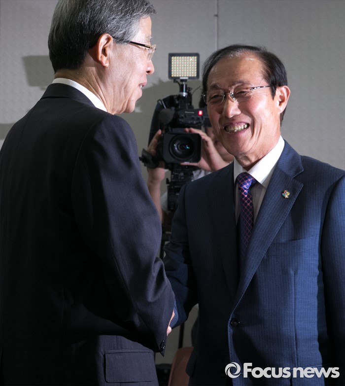 (서울=포커스뉴스) 김희옥(왼쪽) 새누리당 혁신비대위원장이 10일 오후 서울 여의도 당사를 방문한 이원종 대통령비서실장과 면담에 앞서 인사하고 있다.