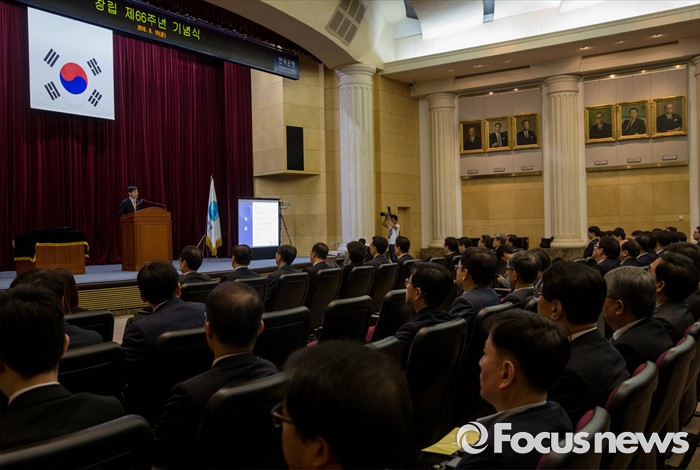 (서울=포커스뉴스) 10일 오전 서울 중구 한국은행 별관에서 열린 '한국은행 창립 66주년 기념식'에 참석한 이주열 한은 총재가 기념사를 하고 있다.