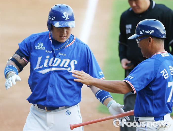 (서울=포커스뉴스) 8일 서울 잠실구장에서 열린 2016 프로야구 삼성-LG 경기 2회초 삼성 선두타자 최형우가 우월 솔로 홈런을 치고 김평호 코치의 환영을 받으며 홈인하고 있다.