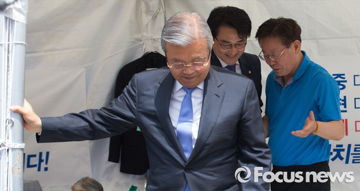 (서울=포커스뉴스) 김종인 더불어민주당 비상대책위원회 대표가 8일 오후 서울 광화문광장에서 지방재정제도 개편을 반대하며 무기한 단식농성 중인 이재명 성남시장을 만나 대화 후 농성장을 나서고 있다.