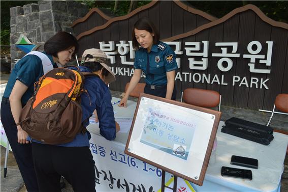 경찰은 주민들의 건의사항을 향후 치안활동에 반영할 방침이다. 또 6월 한 달을 '여성 불안요인 집중 신고기간'으로 설정, 스마트폰의 '국민제보' 어플리케이션이나 112 긴급신고를 통해 치안 불안 요인을 제보 받는다.서울 은평경찰서는 10일 오전 은평구 북한산 국립공원에서 특별치안활동을 실시했다. <사진제공=서울 은평경찰서>