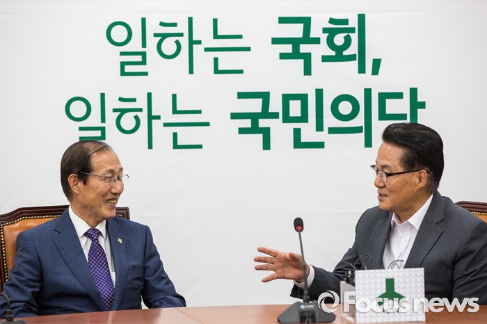 (서울=포커스뉴스) 박지원(오른쪽) 국민의당 원내대표가 10일 오후 서울 여의도 국회에서 이원종 대통령비서실장과 면담을 하고 있다.