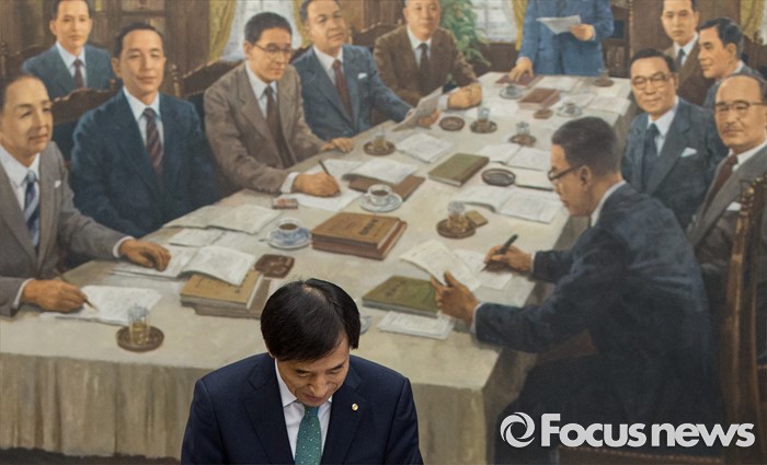 (서울=포커스뉴스) 9일 오전 서울 중구 남대문로 한국은행 본관에서 열린 금융통화위원회 본회의에 참석한 이주열 한국은행 총재가 착석하고 있다.
