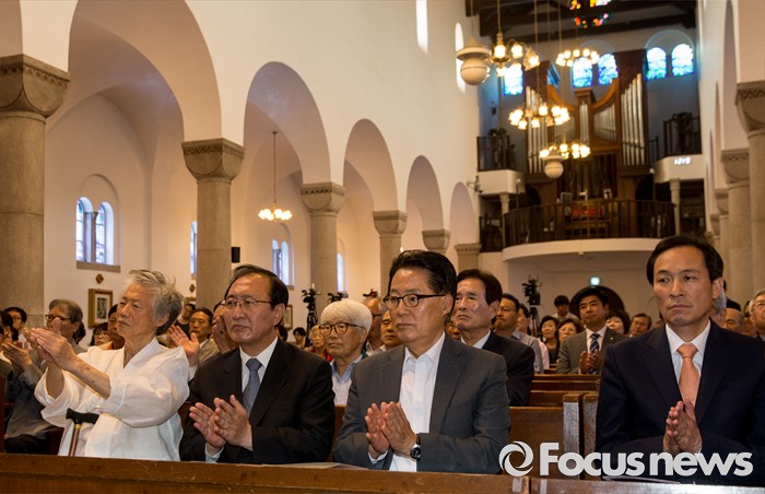 (서울=포커스뉴스) 10일 오전 서울 중구 정동 대한성공회 서울주교좌성당에서 열린 6월항쟁 29주년 기념식에 참석한 백기완(왼쪽부터) 통일문제연구소장과 노회찬 정의당 원내대표, 박지원 국민의당 원내대표, 우상호 더불어민주당 원내대표가 박수치고 있다.