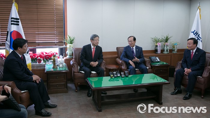 (서울=포커스뉴스) 김희옥(왼쪽 두번째) 새누리당 혁신비대위원장이 10일 오후 서울 여의도 당사를 방문한 이원종(오른쪽 두번째) 대통령비서실장, 김재원(오른쪽 첫번째) 청와대 정무수석과 면담을 하고 있다. 왼쪽 첫번째는 김선동 혁신비대위원장 비서실장.