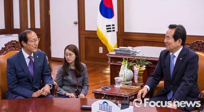 (서울=포커스뉴스) 정세균(오른쪽) 국회의장이 10일 오전 서울 여의도 국회에서 이원종 대통령 비서실장과 면담 하고 있다.