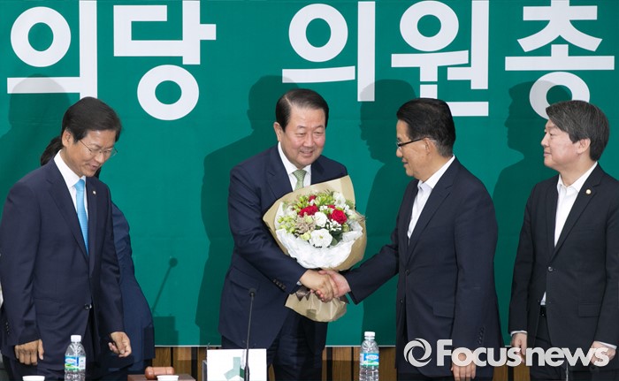 (서울=포커스뉴스) 9일 오전 서울 여의도 국회에서 국회 부의장 후보 선출을 위해 열린 국민의당 의원총회에 참석한 박주선 의원이 지도부로부터 축하를 받고 있다. 왼쪽부터 천정배 공동대표, 박 의원, 박지원 원내대표, 안철수 상임공동대표. 이날 국민의당은 국회 부의장 후보로 박주선 의원을 선출했다.
