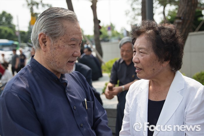 (서울=포커스뉴스) 9일 오후 서울 서대문구 연세대학교 정문 앞에서 열린 '제29주기 이한열 열사 동판 제막식에 참석한 쓰러지는 이한열 열사의 사진을 찍은 정태원(왼쪽) 전 로이터 사진기자와 배은심 이한열 열사의 어머니가 대화하고 있다.