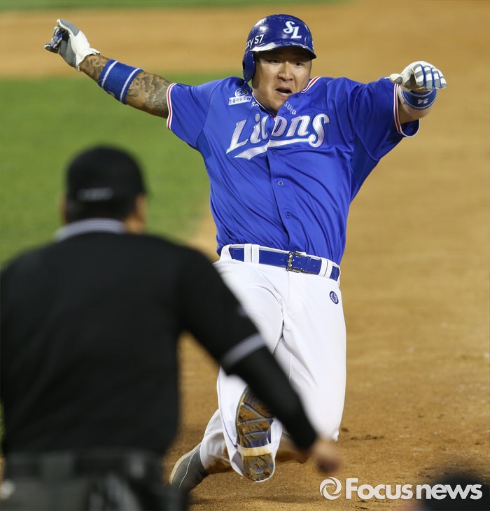(서울=포커스뉴스) 8일 서울 잠실구장에서 열린 2016 프로야구 삼성-LG 경기 5회초 2사 2루에서 삼성 김정혁의 좌전 안타때 2루주자 최형우가 홈까지 달려 슬라이딩하며 세이프되고 있다.