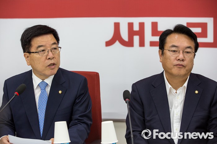 (서울=포커스뉴스) 김광림(왼쪽) 새누리당 정책위의장이 8일 오전 서울 여의도 국회에서 열린 원내대책회의에 참석해 모두발언 하고 있다.