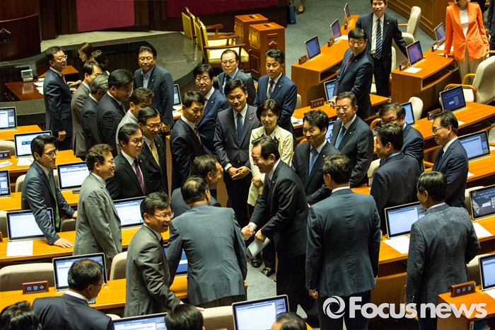 (서울=포커스뉴스) 9일 오후 서울 여의도 국회에서 열린 본회의에서 20대 국회 전반기 국회의장으로 선출된 정세균 더불어민주당 의원이 수락 연설을 하기 위해 연단으로 이동하며 동료의원들에게 축하 받고 있다.