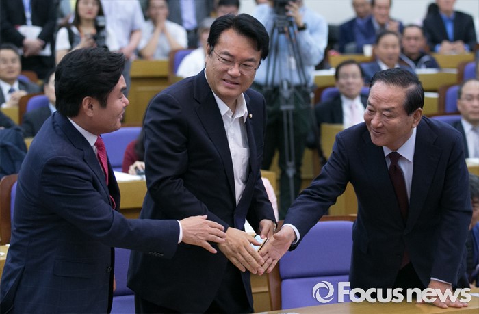 (서울=포커스뉴스) 8일 오전 서울 여의도 국회 의원회관에서 열린 국가미래전략포럼(일명 알파포럼) 창립총회 및 강연회에 참석한 정진석(가운데) 새누리당 원내대표와 서청원(오른쪽) 전 최고위원, 원유철 전 원내대표가 악수하고 있다. 이날 정 원내대표와 서 전 최고위원은 국회의장직을 야당에 양보한다는 뜻을 밝혔다.