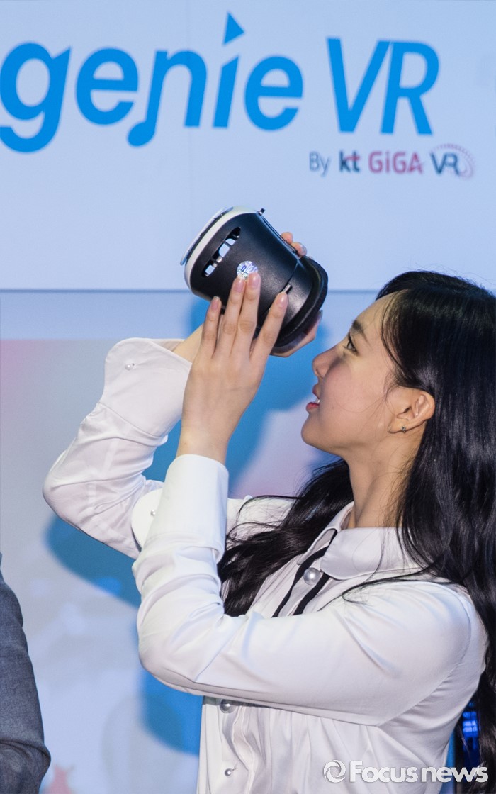 (서울=포커스뉴스) 9일 오전 서울 종로구KT스퀘어에서 열린 KT뮤직 VR서비스 론칭 기자간담회에 참여한 걸그룹 트와이스의 멤버 나연이 관련 서비스를 체험하고 있다.