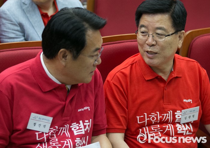 그는 "시‧도당별로 중첩되거나 너무 편중된 상임위에 대해선 조정을 당부드린다"고도 덧붙였다.10일 오전 경기도 과천 국가공무원인재개발원에서 열린 2016 새누리당 정책워크숍에 참석한 정진석(왼쪽) 원내대표와 김광림 정책위의장이 대화하고 있다. 2016.06.10 박동욱 기자