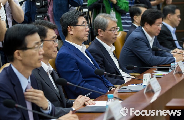(서울=포커스뉴스) 8일 오전 서울 종로구 정부서울청사에서 열린 구조조정 관계장관회의에서 참석자들이 굳은 표정을 짓고 있다.