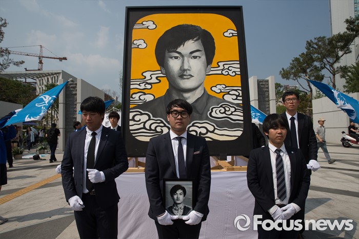 (서울=포커스뉴스) 9일 오후 서울 서대문구 연세대학교 정문 앞에서 열린 '제29주기 이한열 열사 동판 제막식에 참석한 학생들이 이한열 열사의 영정사진과 대형 초상화를 들고 식장에 들어서고 있다.