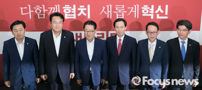 (서울=포커스뉴스) 8일 오후 서울 여의도 국회 새누리당 원내대표실에서 20대 국회 원구성 협상 등을 위한 3당 원내지도부 회동에 참석한 의원들이 포즈를 취하고 있다. 오른쪽부터 박완주 더불어민주당 원내수석부대표, 김도읍 새누리당 원내수석부대표, 우상호 더불어민주당 원내대표, 박지원 국민의당 원내대표, 정진석 새누리당 원내대표, 김관영 국민의당 원내수석부대표.
