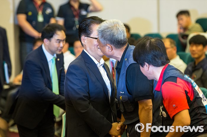 (서울=포커스뉴스) 박지원(오른쪽 세 번째) 국민의당원내대표와 김동만(오른쪽 두 번째) 한국노총 위원장이 9일 오전 서울 여의도 국회도서관 강당에서 열린 '위기의 조선산업 및 노동자 구조조정 해법 모색 대토론회'에 참석해 인사 하고 있다.