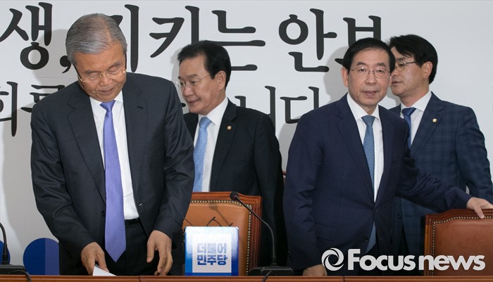 (서울=포커스뉴스) 8일 오전 서울 여의도 국회에서 구의역 스크린도어 노동자 사망 사건과 관련해 열린 더불어민주당-서울시 정책간담회에 김종인(왼쪽) 비대위 대표와 박원순 서울시장 등 의원들이 참석하고 있다.