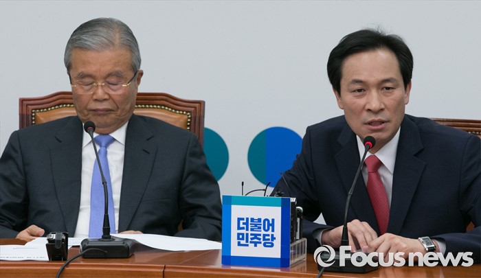 (서울=포커스뉴스) 8일 오전 서울 여의도 국회에서 열린 더불어민주당 비상대책위원회의에 참석한 우상호 원내대표가 발언하고 있다. 왼쪽은 김종인 비대위 대표.