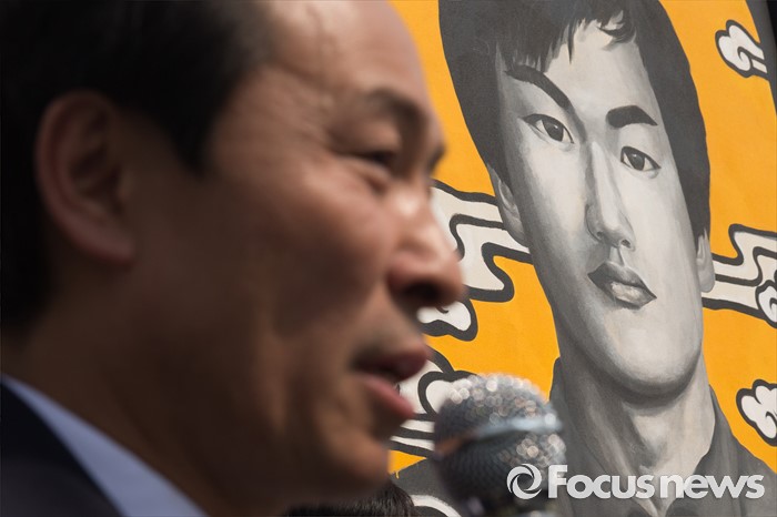 (서울=포커스뉴스) 9일 오후 서울 서대문구 연세대학교 정문 앞에서 열린 '제29주기 이한열 열사 동판 제막식에 참석한 87년 당시 연세대학교 총학생회장을 지낸 더불어민주당 우상호 의원이 인사말을 하고 있다.