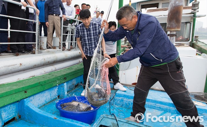 (서울=포커스뉴스) 10일 오후 서울 성동구 뚝도나루에서 박태원 연평면 어촌계장이 서해 5도산 활어를 꺼내고 있다. 6월부터 8월까지 2, 4주 금요일에 뚝도시장에 수산물 장서는 날을 운영하며 9월부터는 7일장 형태로 상설운영 할 예정이다.