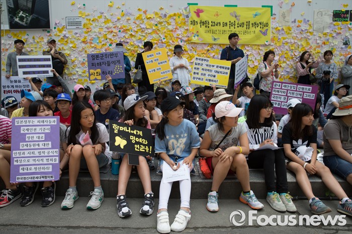 (서울=포커스뉴스) 8일 오후 서울 종로구 옛 일본대사관 앞에서 열린 제 1234차 일본군 위안부 문제해결을 위한 정기 수요시위에 참석한 학생들이 피켓을 들고 있다.