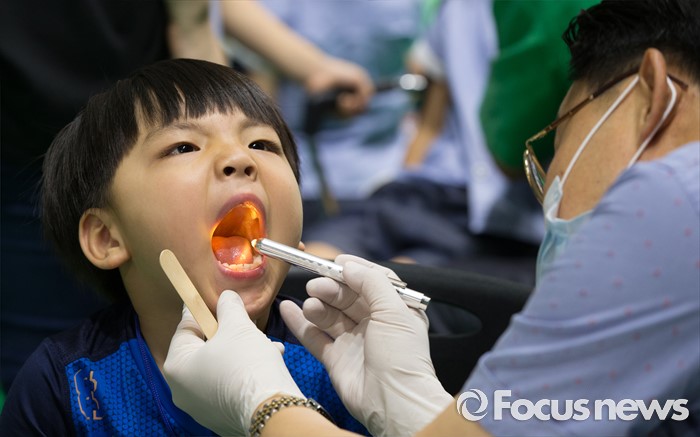 (대전=포커스뉴스) 9일 오전 구강보건의 날을 맞아 대전치과의사회 소속 치과의사들이 대전 서구 대전과학기술대학교에서 어린이집과 유치원 아동 5000여 명을 대상으로 무료 구강검진을 하고 있다.