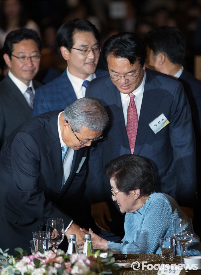 (서울=포커스뉴스) 9일 오후 서울 여의도구 63빌딩 그랜드볼룸에서 열린 '6.15 남북정상회담 16주년 기념식'에 참석한 김종인 더불어민주당 비상대책위원회 대표(왼쪽)와 이희호 여사가 악수하고 있다.