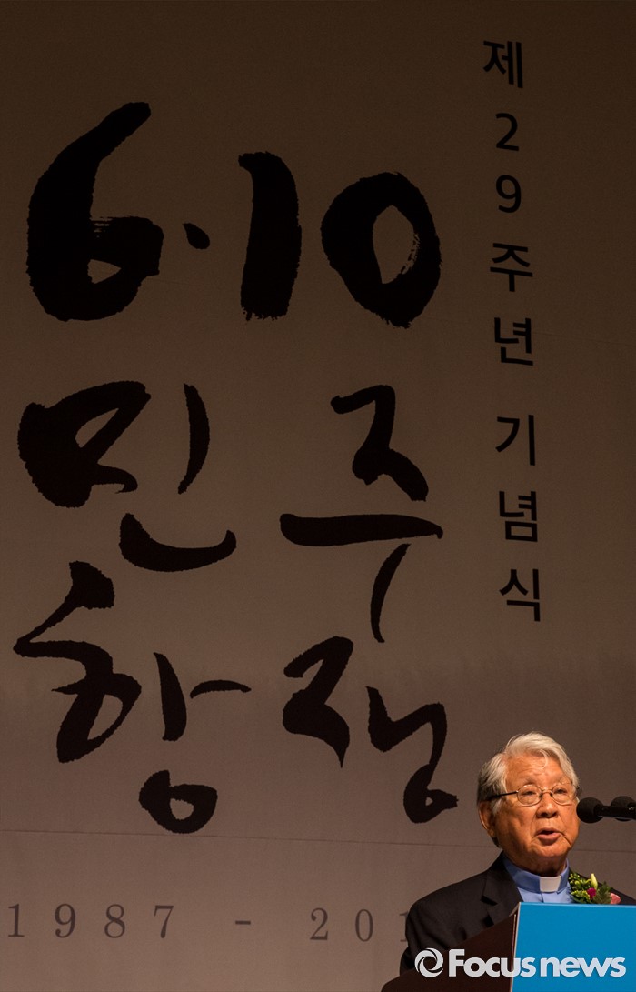 (서울=포커스뉴스) 10일 오전 서울 중구 프레스센터에서 열린 6.10 민주항쟁 제29주년 기념식에 참석한 박상증 민주화운동기념사업회 이사장이 기념사를 하고 있다.
