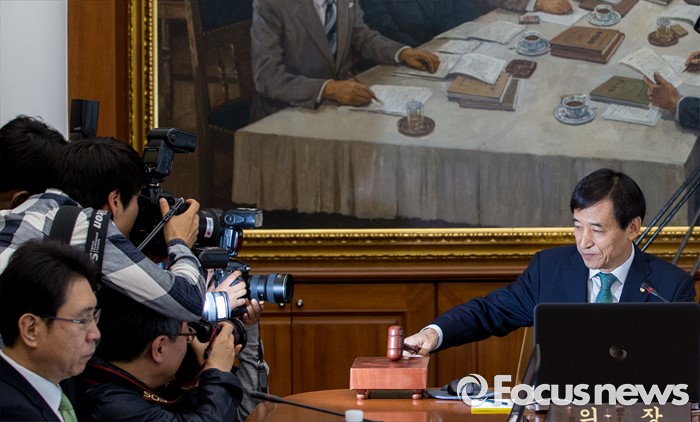 (서울=포커스뉴스) 9일 오전 서울 중구 남대문로 한국은행 본관에서 열린 금융통화위원회 본회의에 참석한 이주열 한국은행 총재가 개회를 알리는 의사봉을 두드리고 있다.