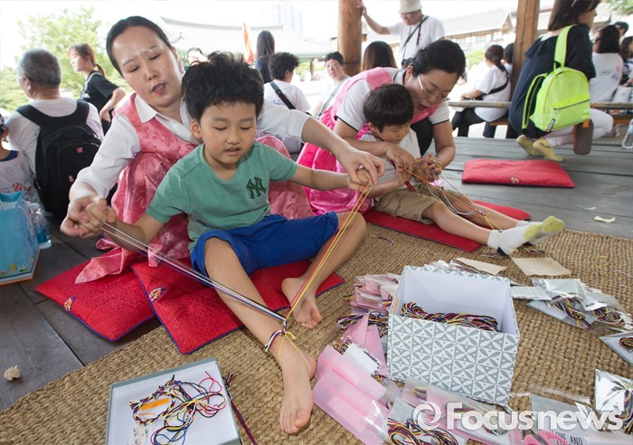 (서울=포커스뉴스) 9일 오후 단오 세시풍속을 체험하기 위해 서울 중구 남산 한옥마을을 방문한 어린 아이들이 장명루 만들기 체험을 하고 있다.