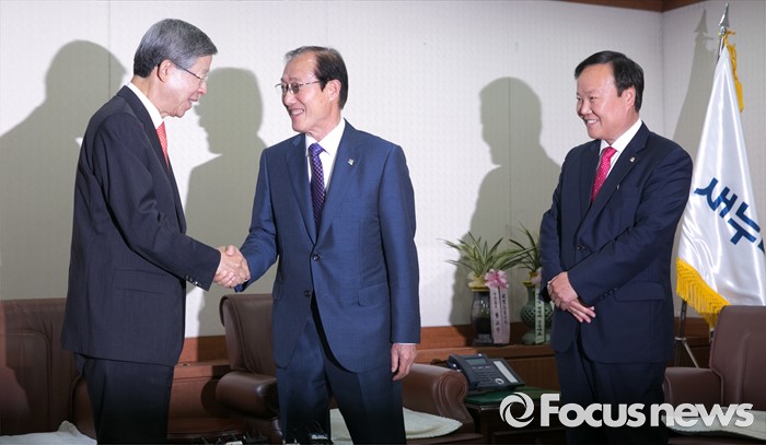 (서울=포커스뉴스) 김희옥(왼쪽) 새누리당 혁신비대위원장이 10일 오후 서울 여의도 당사를 방문한 이원종(가운데) 대통령비서실장, 김재원 청와대 정무수석과 면담에 앞서 인사하고 있다.