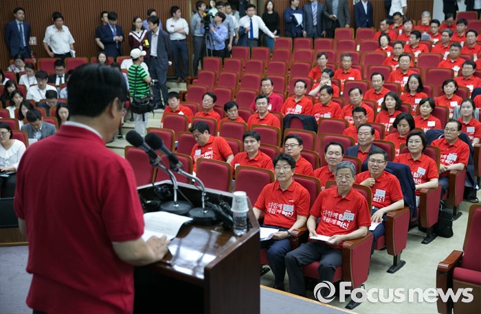 (과천=포커스뉴스) 10일 오전 경기도 과천 국가공무원인재개발원에서 열린 2016 새누리당 정책워크숍에 참석한 의원들이 정진석 원내대표의 인사말을 듣고 있다.