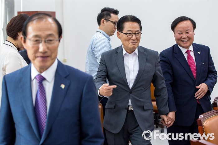 (서울=포커스뉴스) 박지원(가운데) 국민의당 원내대표가 10일 오후 서울 여의도 국회에서 이원종(왼쪽) 대통령비서실장, 김재원 청와대 정무수석과 면담을 마친 뒤 배웅 하고 있다.