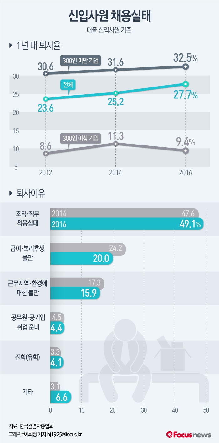 한국경영자총협회(경총)가 발표한 '2016년 신입사원 채용실태 조사'에 따르면, 대졸 신입사원의 1년 내 퇴사율은 27.7%로 집계됐다. 2014년(27.7%)보다 2.5%포인트 증가한 수치다.