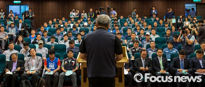 (서울=포커스뉴스) 김동만 한국노총 위원장이 9일 오전 서울 여의도 국회도서관 강당에서 열린 '위기의 조선산업 및 노동자 구조조정 해법 모색 대토론회'에 참석해 인사말을 하고 있다.