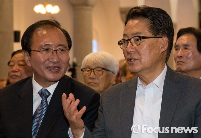 (서울=포커스뉴스) 10일 오전 서울 중구 정동 대한성공회 서울주교좌성당에서 열린 6월항쟁 29주년 기념식에 참석한 노회찬(왼쪽) 정의당 원내대표와 박지원 국민의당 원내대표가 대화하고 있다.