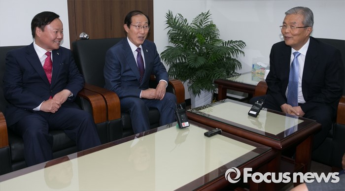 (서울=포커스뉴스) 김종인(오른쪽) 더불어민주당 비대위 대표가 10일 오후 서울 여의도 국회를 방문한 이원종(가운데) 대통령비서실장, 김재원 청와대 정무수석과 면담을 하고 있다.