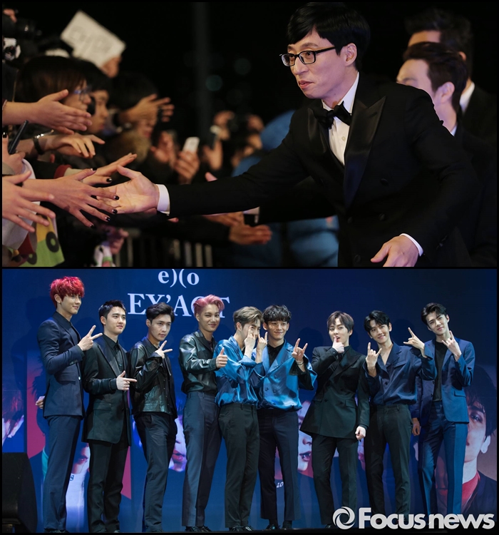 엑소는 오는 9일 방송되는 Mnet ‘엠카운트다운’을 통해 본격적인 정규 3집 ‘이그잭트’ 활동에 돌입한다.보이그룹 엑소(찬열‧디오‧레이‧카이‧수호‧첸‧시우민‧백현‧세훈)가 ‘무한도전’ 유재석과의 합동 무대에 기대감을 내비쳤다. 8일 오전 서울 삼성동 SMTOWN 코엑스 아티움에서 열린 정규 3집 ‘이그잭트(EX’ACT)’ 발매 기념 기자회견에서다. 사진은 유재석(위)-엑소.