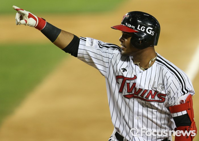 (서울=포커스뉴스) 9일 서울 잠실구장에서 열린 2016 프로야구 삼성-LG 경기 5회말 2사 1루에서 LG 히메네스가 좌월 2점 홈런을 치고 홈인하며 가족을 향해 세레머니를 하고 있다.