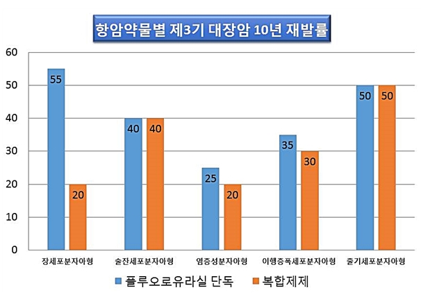 장세포분자아형에서 플라오로유라실만 단독 투여할 경우 10년 재발확률이 55%에 이르렀으나, 옥살리플라틴과 플라오로유라실 복합제재 투여결과에서는 재발률이 20%에 그쳐 높은 치료효과를 보여줬다.
