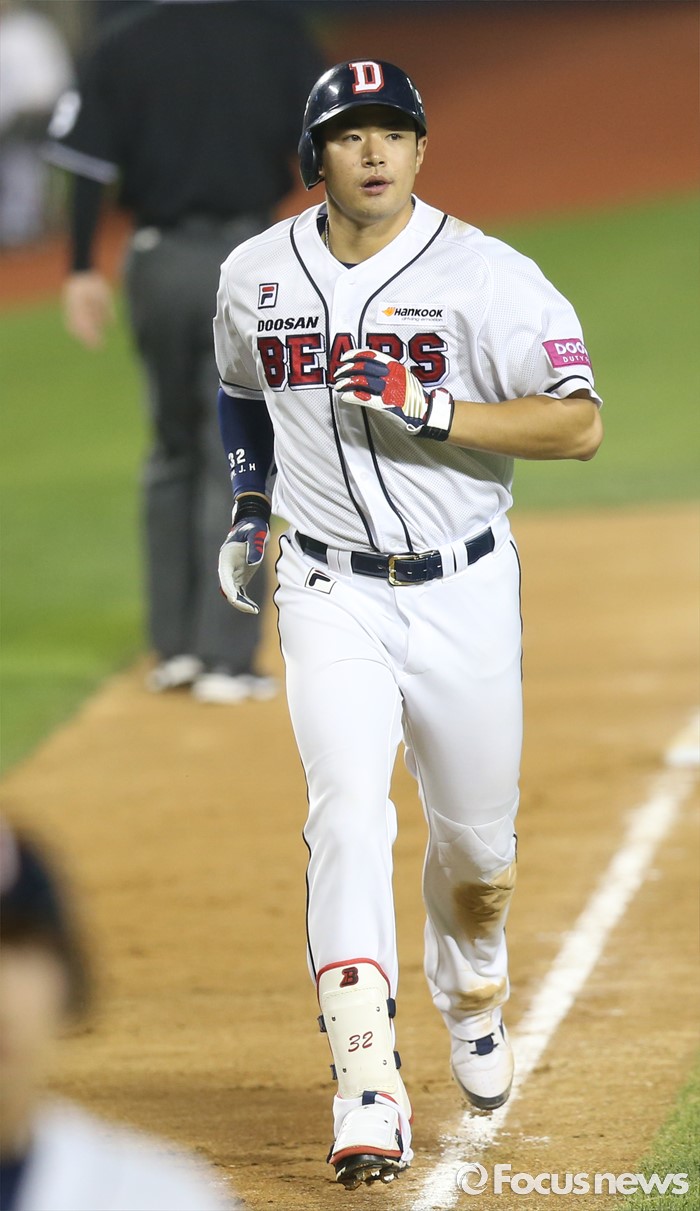 (서울=포커스뉴스) 10일 서울 잠실구장에서 열린 2016프로야구 롯데-두산 경기 6회말 무사 1,2루에서 두산 김재환이 우월 3점 홈런을 치고 홈인하고 있다.