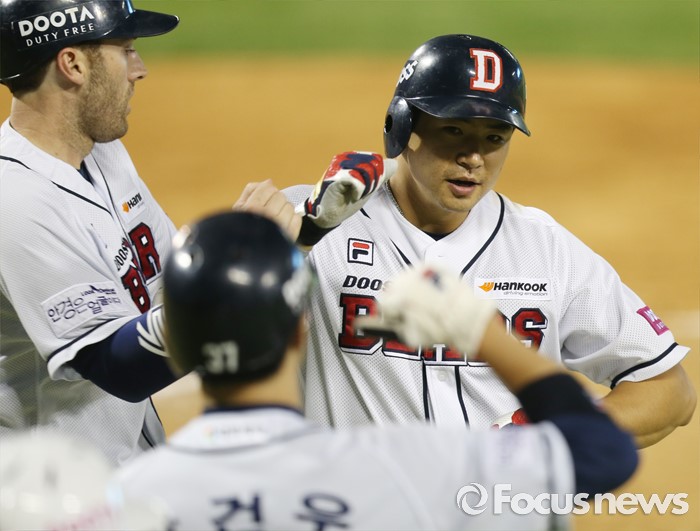 (서울=포커스뉴스) 10일 서울 잠실구장에서 열린 2016프로야구 롯데-두산 경기 6회말 무사 1,2루에서 두산 김재환이 우월 3점 홈런을 치고 선행주자 에반스와 박건우의 환영을 받으며 홈인하고 있다.